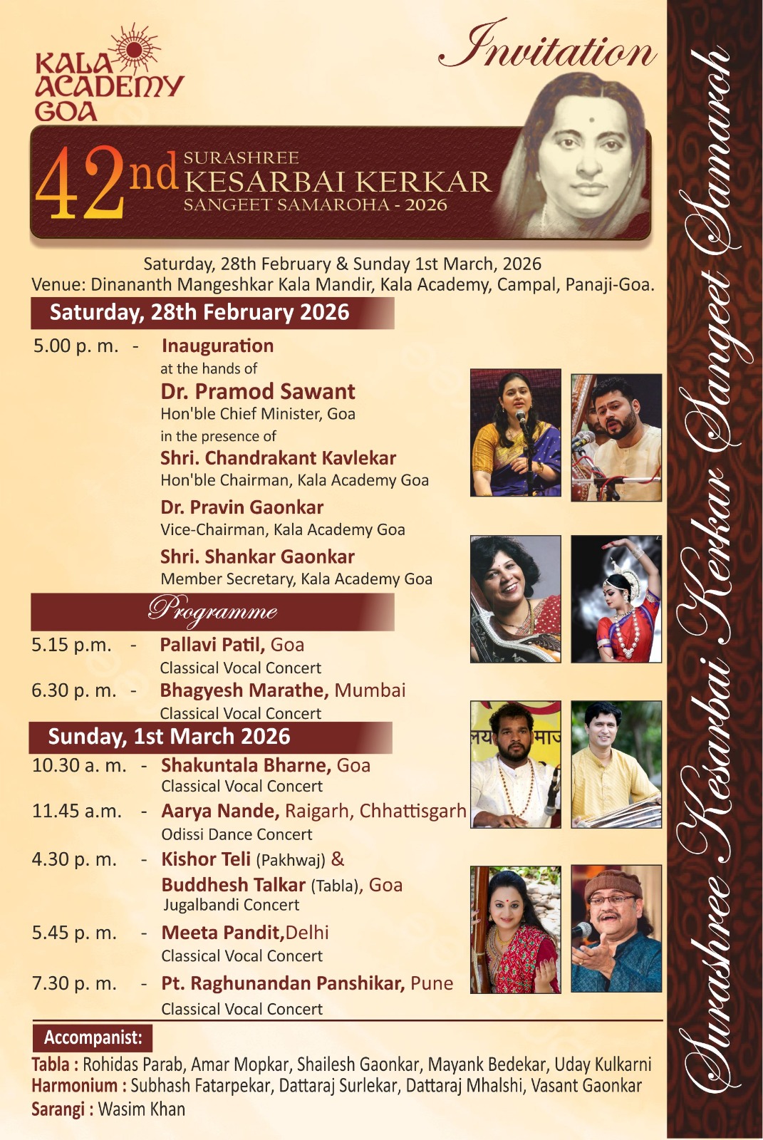 The 42nd Edition of the Surashree Kesarbai Kerkar Sangeet Samaroha will be held on 28th February 2026 and 1st March 2026 The festival will be inaugurated at the hands of Dr. Pramod Sawant, Hon’ble Chief Minister of Goa, in the distinguished presence of Shri. Chandrakant Kavlekar, Hon’ble Chairman of Kala Academy Goa, Dr. Pravin Gaonkar, Vice-Chairman of Kala Academy Goa and Shri. Shankar B. Gaonkar, Member Secretary, Kala Academy Goa on Saturday, the 28th February 2026 at 5.00 p.m at Dinanath Mangeshkar Kala Mandir, Panaji.